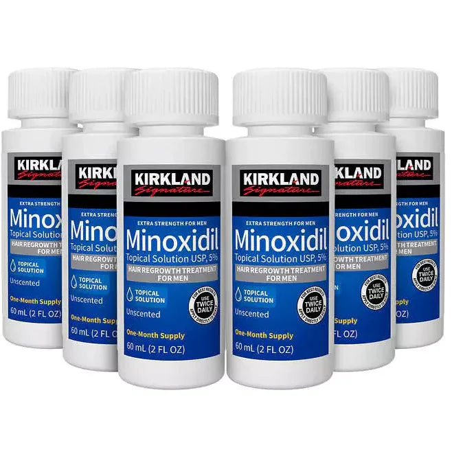 Minoxidil Kirkland 5% (60ml) – Frasco de alta concentración con duración aproximada de 1 mes. Para obtener resultados óptimos y duraderos, se recomienda realizar un tratamiento continuo de 6 meses.