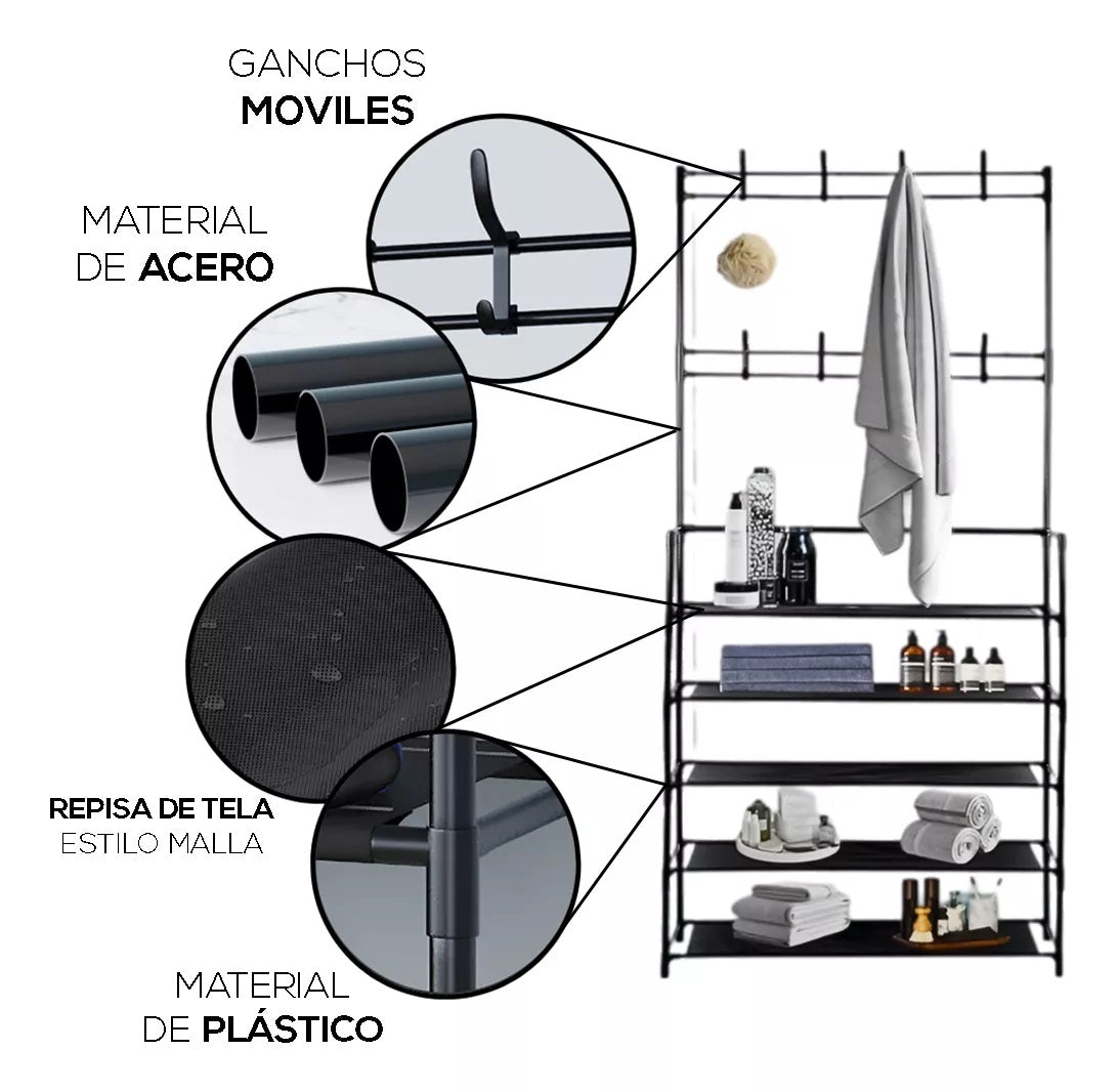 🏡 Ahorra espacio como un pro Diseño vertical con 5 niveles de almacenamiento y perchero superior. ¡Ideal para espacios pequeños!