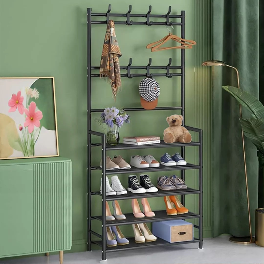 Transforma cualquier rincón en un espacio funcional con nuestro organizador metálico 5 en 1. Guarda tus zapatos, cuelga chaquetas y mantén todo en su lugar — sin sacrificar el diseño.